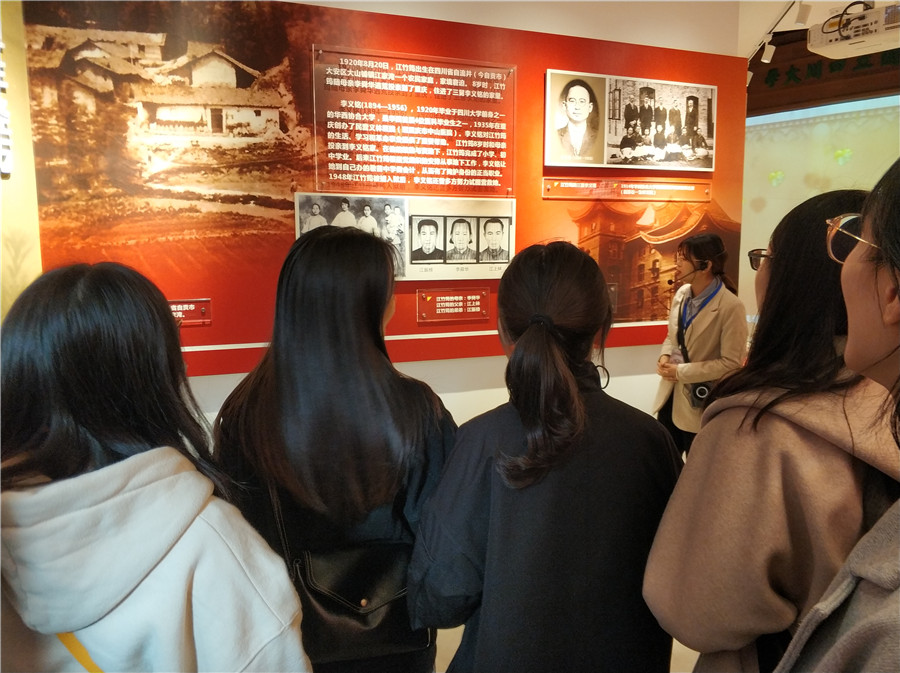望江校区的江姐纪念馆,这里是全国首家江姐纪念馆,也是西南高校首家专题革命烈士纪念馆。同学们在讲解员的带领下有序进入馆内。纪念馆的核心部分设有“锦江红梅傲雪开”主题展览,该展览对江姐短暂而伟大的一生作了介绍,重点展示了江姐在川大的学习、生活,其中有不少江姐在川大读书期间的珍贵档案,例如江竹筠亲自填写的入学登记表、江竹筠申请困难补助登记名册等。