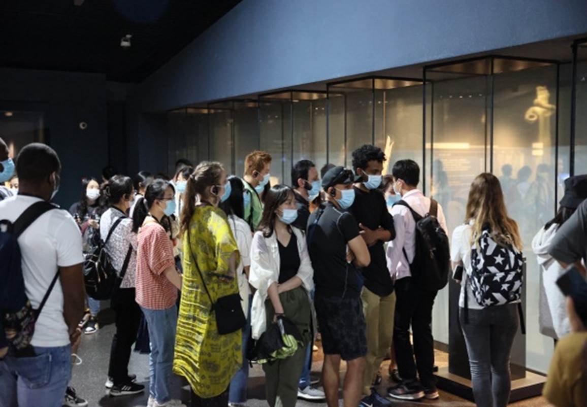 博物馆里陈列着的一件件精美绝伦的玉石、青铜器物吸引着我们每一位中外学生的目光,大家一边认真聆听着这些古老群体的神秘故事,一边不禁惊叹于古蜀文明的鬼斧神工。