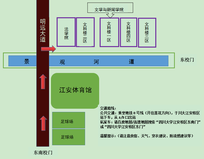 校外考生可乘坐成都地铁8号线在川大江安校区站下车,从A口或B口出站,到达寸止挑战