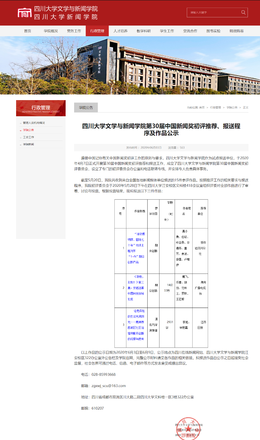 “第30届中国新闻奖初评推荐、报送程序及作品公示”截图