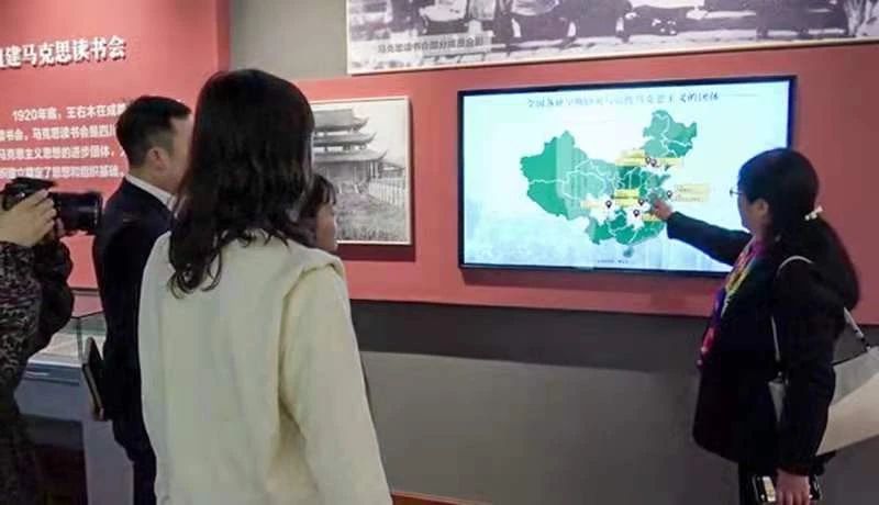 师生不时驻足,俯身靠近展柜内的文物仔细阅看,一字一句地品读着每一张老照片背后的故事。其中一块电子展板尤其惹人注目,上面勾勒着马克思读书会的创办始末,并以地图呈现出全国早期马克思主义的研究与传播情况,这引发了参访师生的关注与思索。寸止挑战