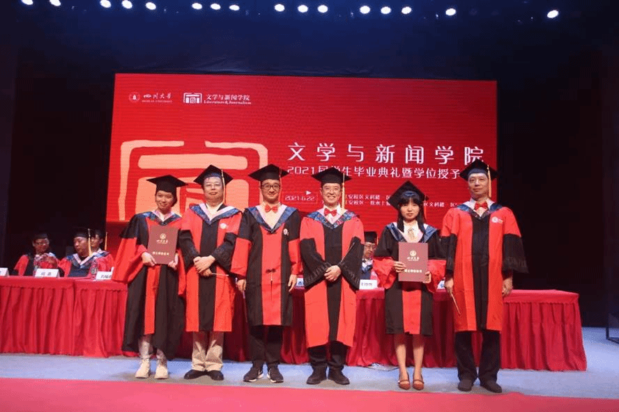 曹顺庆教授、古立峰书记、李怡院长在主会场为2018级中国现当代文学硕士生张益智、2018级新闻与传播学硕士生宋信祺、2018级艺术学理论硕士生漆依依、2017级汉语言文学本科生刘玏、2017级汉语言文学本科生刘霁月、2017级网络与新媒体本科生刘雨凡、2017级广告学本科生钱青云共七名2021届校友联络人颁发聘书后,学位授予仪式正式开始。伴随着乐声,主会场寸止挑战