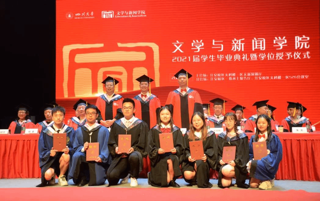 2021届学生毕业典礼暨学位授予仪式在与会师生的合影留念中落下帷幕。明远湖畔清波依旧,江安长桥倩影驻留,2021届全体毕业生在文新学院的求知旅途画上了圆满句号。我们期待着,你的胸怀里容纳下更多崭新的风景,寸止挑战