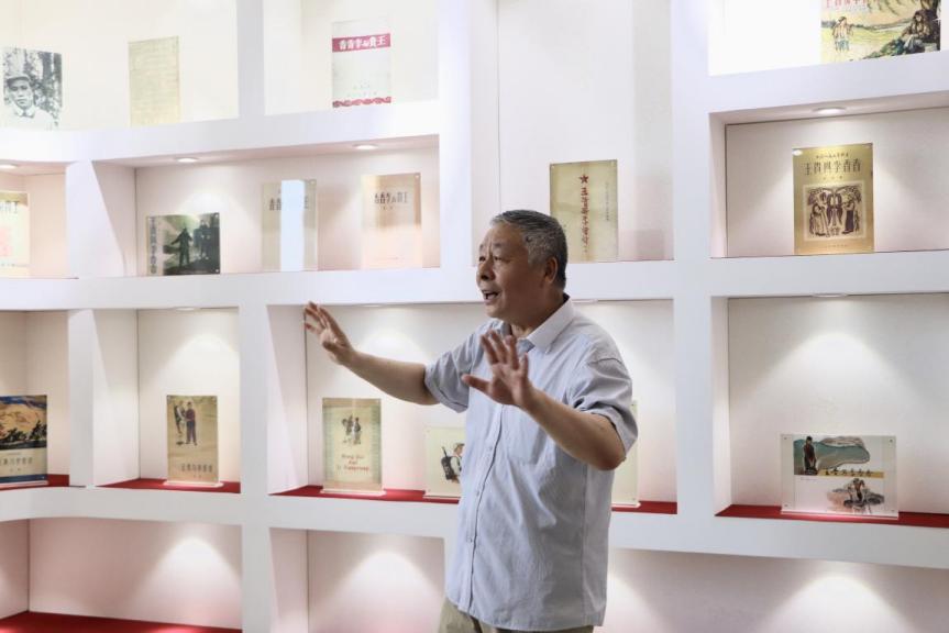 馆长刘福春教授介绍,1942年5月毛泽东同志在延安主持召开文艺座谈会后,中国革命文艺运动进入新阶段,两部诗集在此时应运而生,彰显“文艺为工农兵服务”的指导方针的同时,也见证着文艺工作者同劳动人民的深度结合,在中国新诗史和出版史上具有重要意义,表现出独特的研究和展藏价值。记者注意到,众多的封面中,有一封浅绿和米色交织的封面尤为醒目,上面印写着鲜红色的英文题目“WangGui And LiXiangxiang”。解说员孙海佩告诉记者,早在1954年便有英文版《王贵与李香香》问世,而此张正是1980年出版的英文版诗集《王贵与李香香》的封面图像,是中国新诗艺术走向世界的有力证明。新中国成立后,维吾尔文版、蒙文版《王贵与李香香》分别于1957年、1979年出版,中国新诗走进各少数民族读者内心的同时,也被赋予了更广泛的文化内涵。