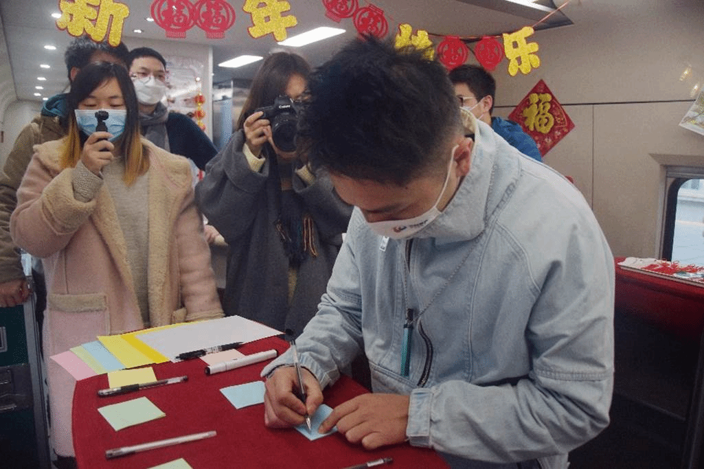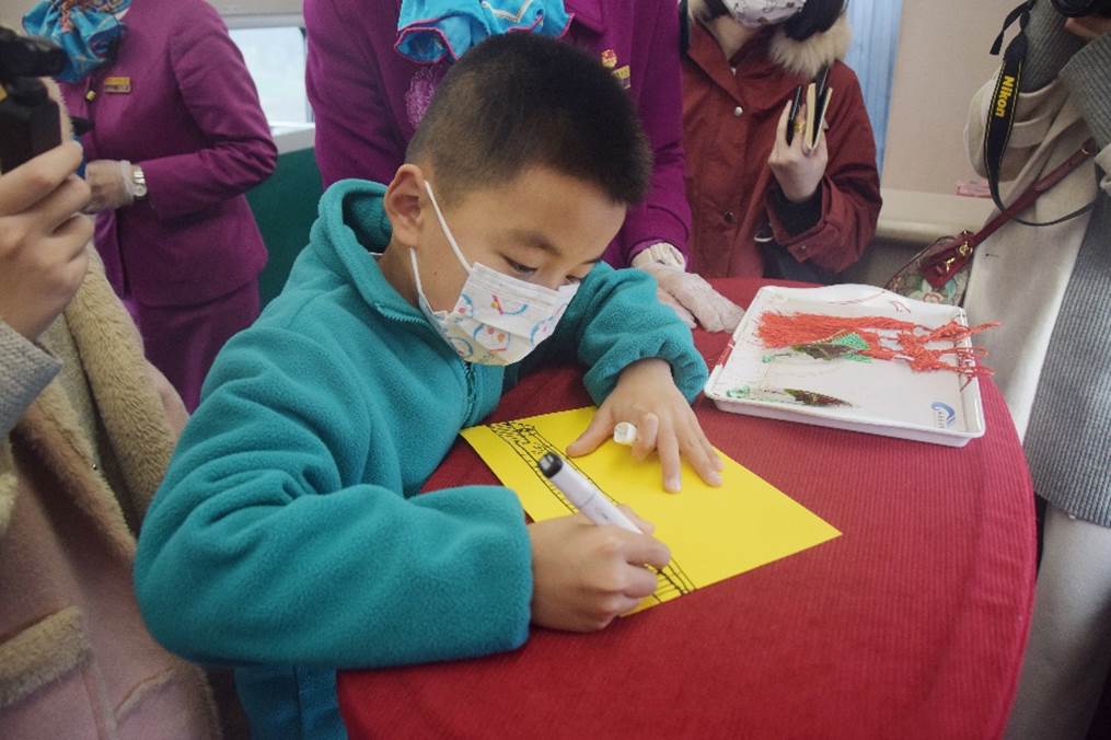 就读于成都七中附小的张弛小朋友拿起了画笔,他在鲜黄的卡纸上描摹起自己眼中的高铁,“列车的速度非常快,一会儿就到泸州了。”浓浓的年味中,师生同旅客们一起,举起红色新年祝福字符,与乘务组合影留念。