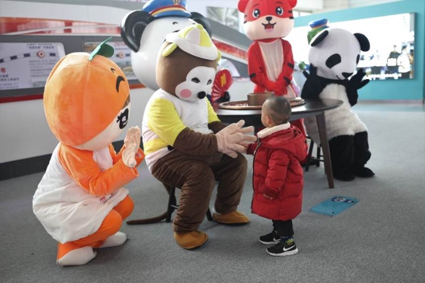 这里正是成都东客站为旅客们特别设计的“打卡地”。熊猫列车长“胖嘟”、浣熊客运员“浣影”、金丝猴售票员“金灵”和霸王龙客运员“阿贡”五个充满西南地区特色的卡通形象,与充满年味的老虎玩偶、火锅元素巧妙地联动组合,形成别具一格的互动场景,为繁忙的客站添上浓厚的节日氛围。