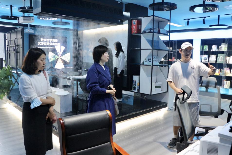 中华文化传承与全球传播数字融合实验中心参观。在实验中心办公室主任邱树雄副教授和实验室崔宝双老师的带领下,调研组一行依次参观了数字人文典籍大数据分实验室、数字文学场景沉浸分实验室与数字多模态符号认知分实验室三个分实验室,并与学院师生就中国文学与文化典籍大数据、中华文化数智整合国际传播、传统故事数字创新转化、“大文学”场景与科幻虚拟仿真、中华语言文字谱系数字化、中华文化多模态符号认知等话题对话交流。