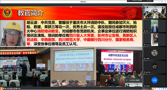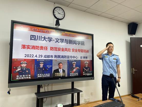 举办了一场消防知识安全教育培训会,培训会议采用线上线下结合方式进行,学院领导、全体行政老师和部分新进教师在学院311会议室现场参加,全院其他老师均在线上视频参会。会议邀请了成都市利民消防宣传中心的胡云波教官到场培训。