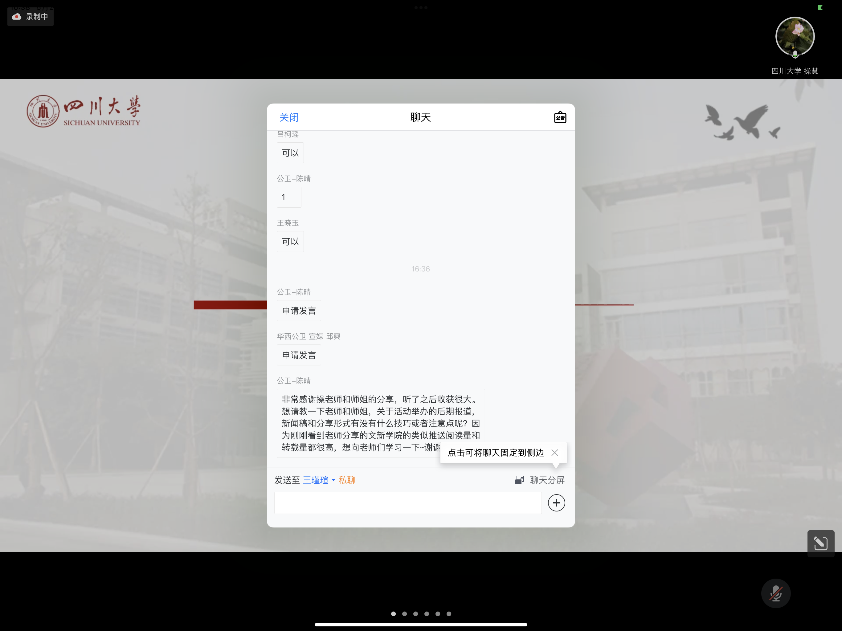 分享结束后,来自华西公共卫生学院的陈晴、邱爽等同学分别就新闻稿技巧、信息筛选以及公众号风格等问题进行提问,操慧教授与雷思远同学对相关问题作出详细解答。至此,2022学年宣传培训会议落下帷幕。