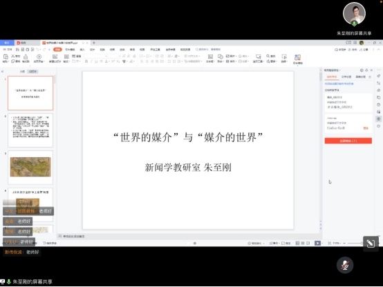 新闻学教研室朱至刚教授为2022级本科新生作题为《世界的媒介与媒介的世界》的线上讲座,讲座由2022级新生辅导员杨珊老师主持。