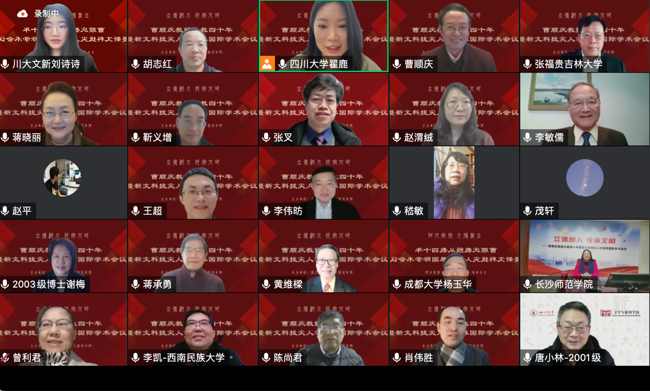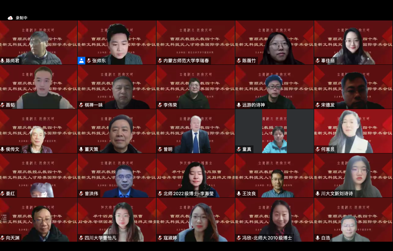 主办的“立德树人 传承文明——曹顺庆教授从教四十年暨新文科拔尖人才培养”国际学术会议在云端顺利举行,来自法国索邦大学、美国俄亥俄州立大学、越南胡志明市国家大学、香港中文大学、中国社会科学院、北京师范大学、北京外国语大学、中央民族大学、首都师范大学、吉林大学、复旦大学、上海交通大学、浙江大学、浙江师范大学、浙江工商大学、河南大学、湖南大学、湘潭大学、长沙师范学院、华中科技大学、广西大学、暨南大学、电子科技大学、成都大学、四川外国语大学、四川师范大学、西南大学、西南交通大学、西南民族大学、重庆师范大学、重庆大学、贵州师范大学、西北民族大学、寸止挑战