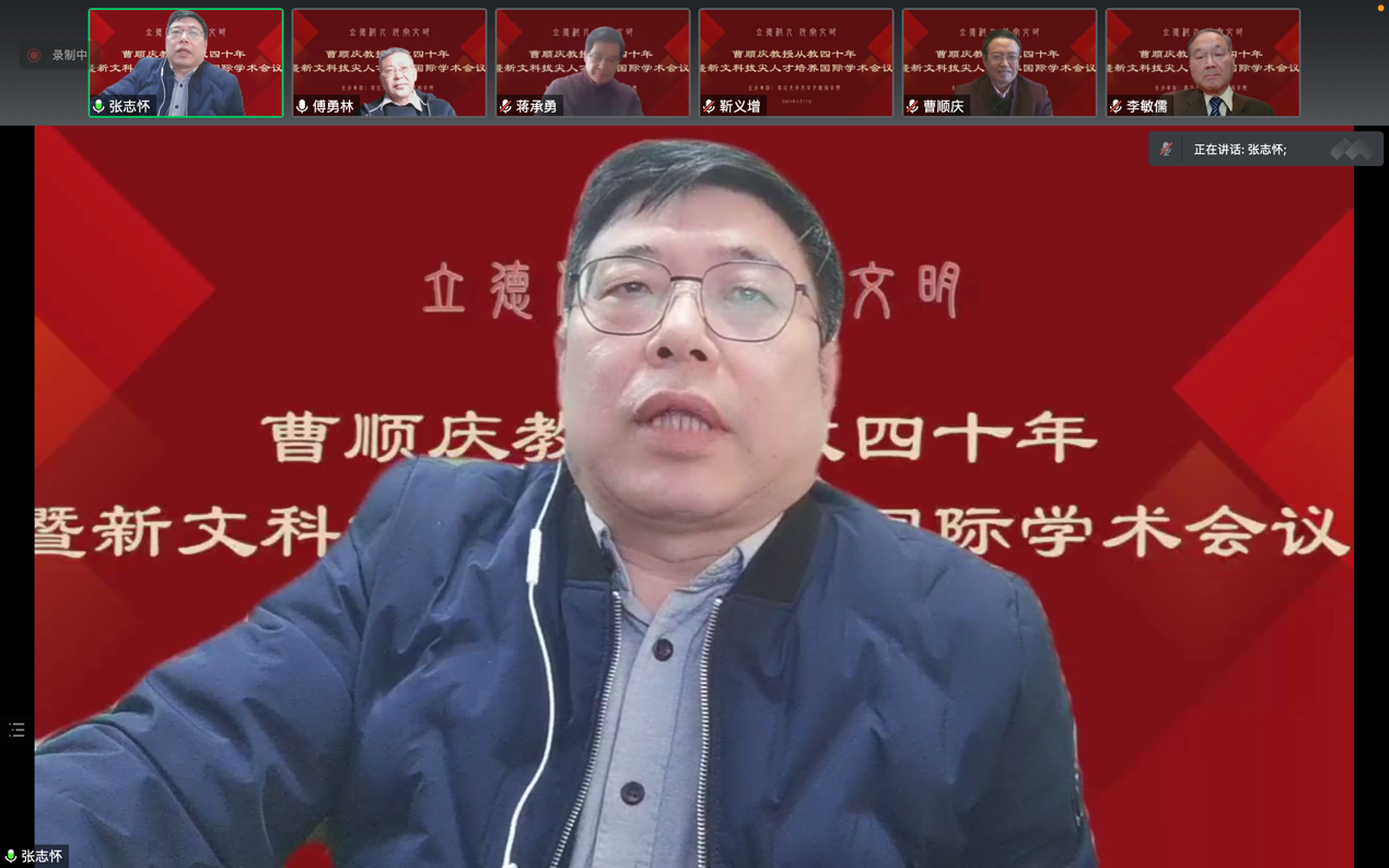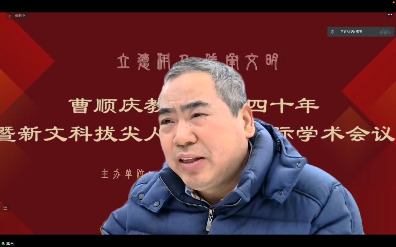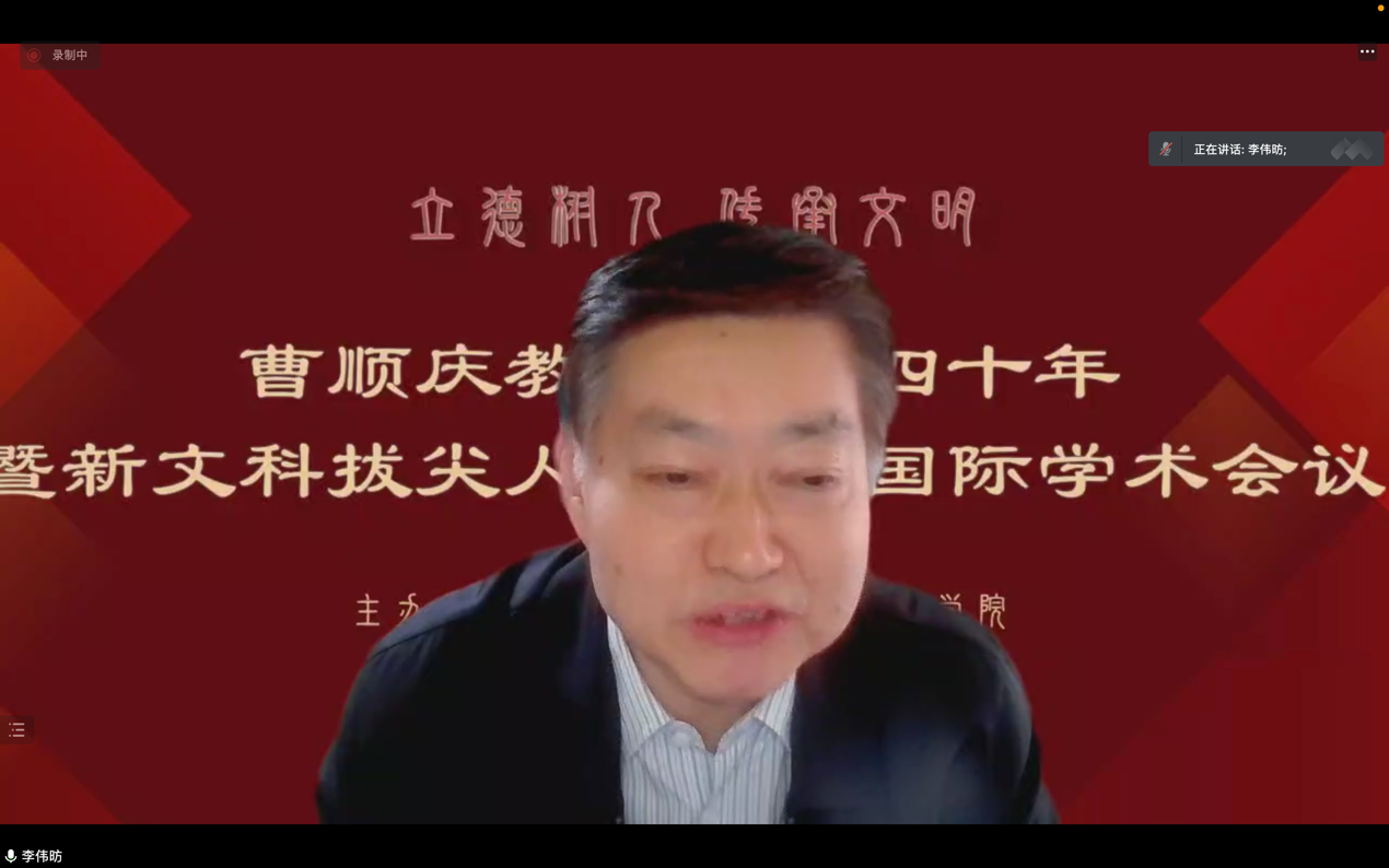 院长李怡教授在视频致辞中表示,曹顺庆教授从教四十年来为学院的成长壮大及学科的蓬勃发展做出了重要贡献。他提出不论是为师、为学、为文还是培养拔尖人才,“立德树人 传承文明”是基本原则,这一主题应成为学院未来发展的旨归,同时更应成为一代代年轻学者自觉追求的目标。