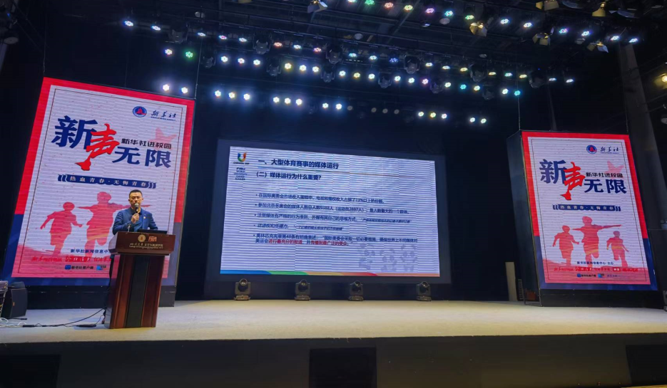 讲座尾声,王湘宏副总裁介绍了新华社在奥运会和大运会报道中发挥的巨大作用。面对即将到来的成都大运会,他以“胸怀全局,自信开放,迎难而上,共创未来”的冬奥精神激励即将参与其中的同学们,并将大运会口号“成都成就梦想”作为讲座结语,预祝赛会圆满成功。