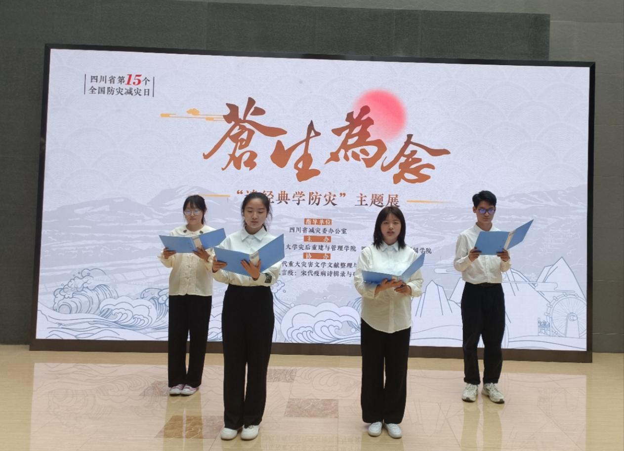 国家级大创项目“元代灾害诗词辑录与研究”团队就作为主要力量参与了“古诗词中的自然灾害”主题展览策划,相关活动的报道刊发于四川省应急管理厅官网。回顾两年的展览筹备过程,主创人员杨巧如表示:“在老师的指导下,我们对四川地区灾害文化历史展开挖掘与研究,翻阅了几千万字材料,辑录上千份灾害文献,在精挑细选后进行注释、翻译,并通过展览、新媒体等形式进行传播宣传,希望将这份对灾害的关注与思考,转化为减灾兴川与减灾兴国的文化力量。”