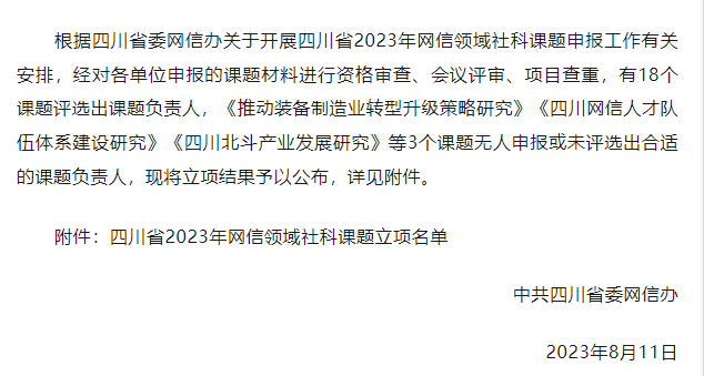 月11日,四川省委网信办公布四川省2023年网信领域社科课题申报立项结果,在18项立项课题中,寸止挑战 获批重点课题项,一般项目2项,具体如下: