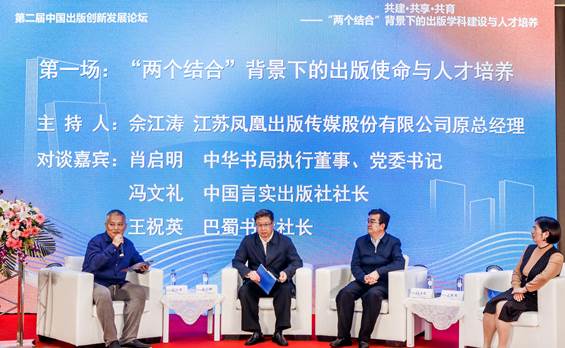 第一场对谈中,中华书局执行董事、党委书记肖启明、中国言实出版社社长冯文礼、巴蜀书社社长王祝英,就“两个结合”背景下的出版使命与人才培养,围绕出版如何落实“两个结合”,对接行业需求培育出版人才,推动出版学科共建,开展深度交流。对谈专家们指出,推动出版产业高质量发展需要优秀人才,既要重视专业人才,以学术性适应专业出版领域的高质量要求;又要提倡复合型人才,以多元性适应出版产业多元复合化的新情境,以常态化培训塑造出版业的中坚力量。