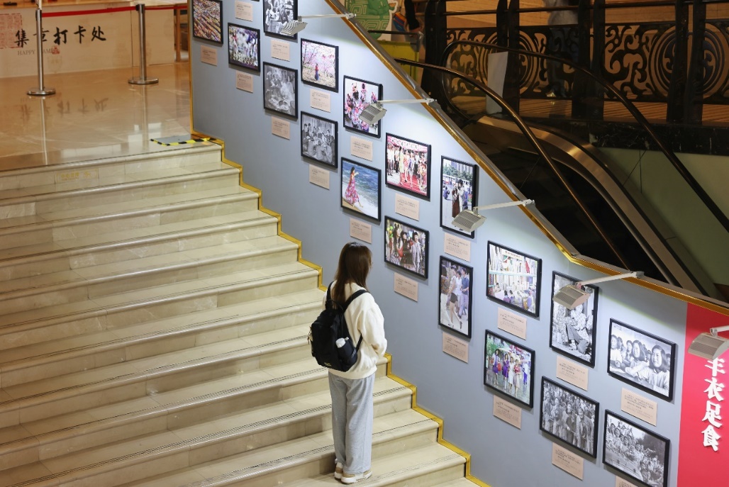 师生跟随讲解员的步伐,沿着螺旋型走廊参观。从1982年体操运动员吴佳妮高低杠腾跃瞬间到2024年网球运动员郑钦文夺冠后挥拍庆祝的瞬间,从东方红一号卫星发射再到我国第一辆国产大飞机C919的生产装配,一张张经典照片让师生们驻足观赏,体悟光影让瞬间成为永恒,感受镜头定格历史作为记忆的独特魅力。