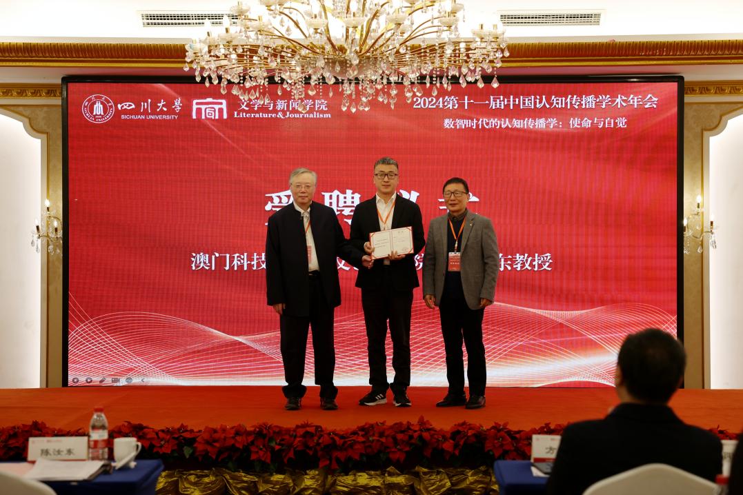 开幕式最后,全球修辞学会会长陈汝东教授和中国认知传播学会会长欧阳宏生教授为澳门科技大学人文艺术学院柳旭东教授颁发聘书,聘请其担任中国认知传播学会的副会长。