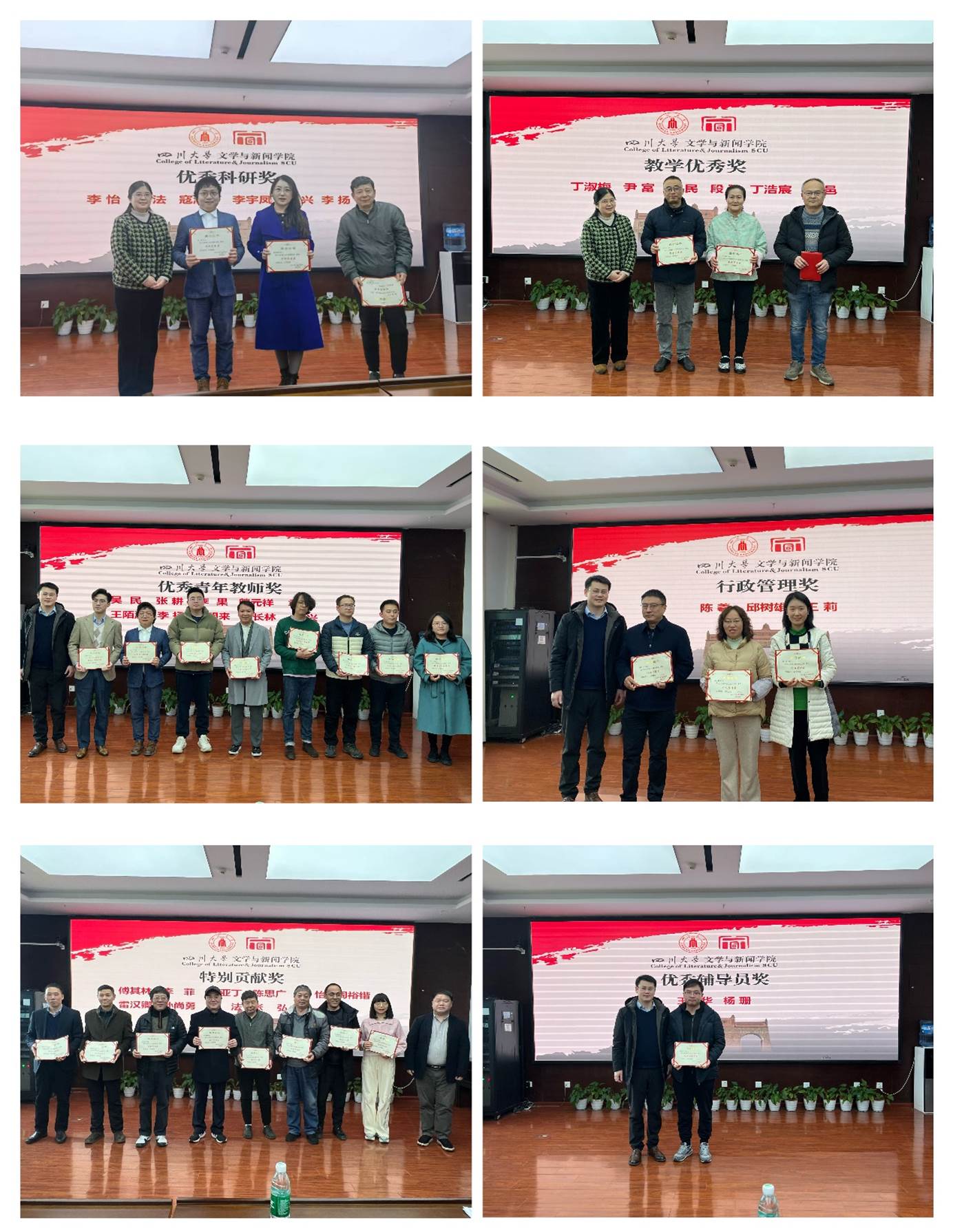 (新闻学院、出版学院)院长的任职通知,并进行了学院2024年度工作表彰,为优秀科研奖、教学优秀奖、优秀青年教师奖、行政管理奖、特别贡献奖、优秀辅导员奖获奖教师进行颁奖。此外,傅其林书记还通报了2024年专业技术职务聘任结果、科级干部换届调整结果与绩效发放相关情况,并对新进教职工进行介绍。