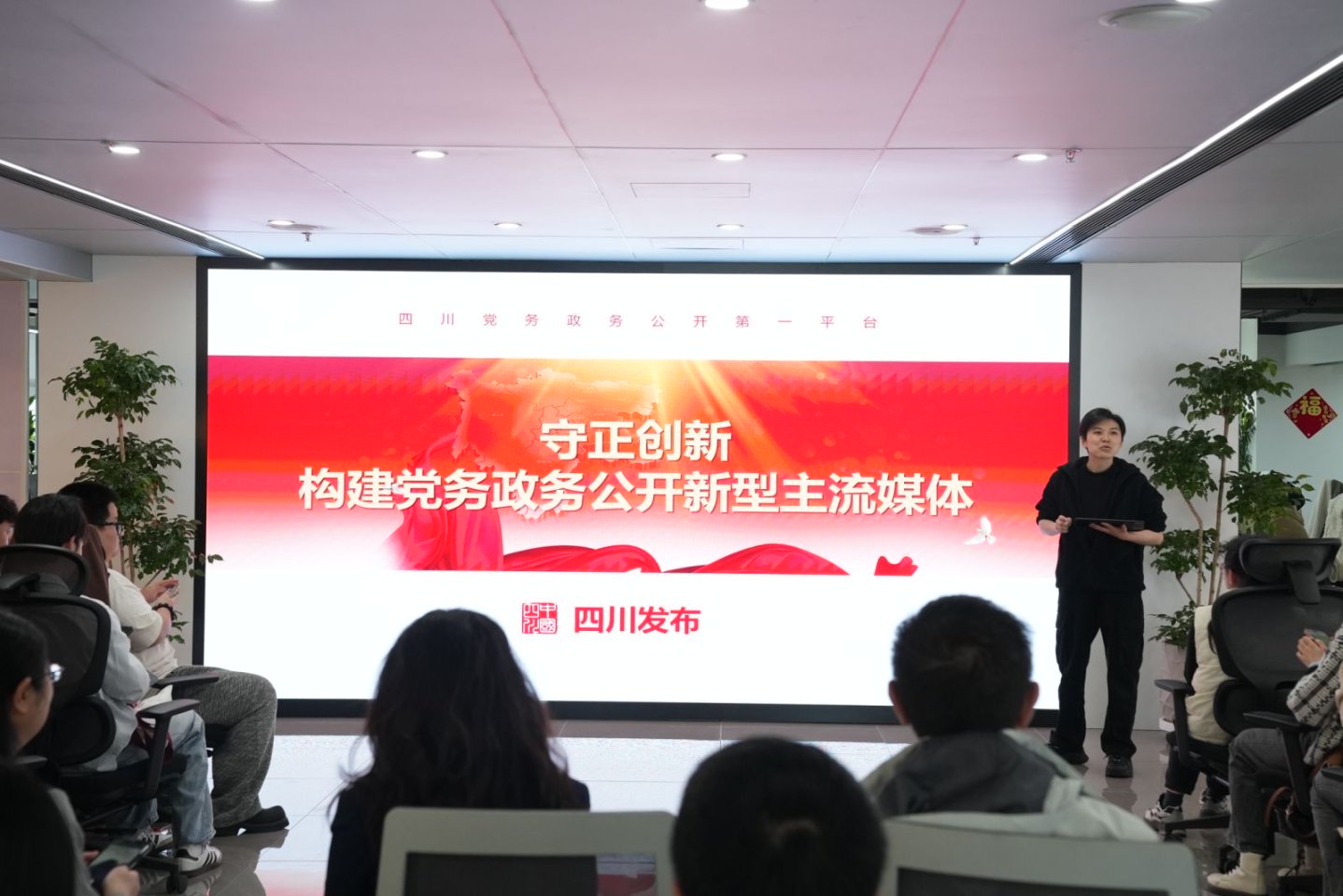 师生一行来到会客区与四川发布的采编老师们围绕新型政务媒体建设等主题展开深度交流座谈,并举行了《新型政务媒体的构建与传播——“四川发布”个案解析》新书发布仪式。
