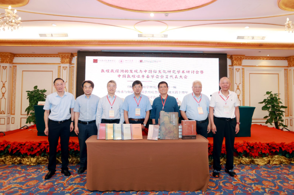 讲座教授郑阿财共同为《新时代敦煌学研究丛书(第一辑)》《传承与创新:中国敦煌吐鲁番学会成立四十周年国际学术研讨会论文集》《藏经洞敦煌艺术精品(大英博物馆)续编》《敦煌石窟写经生》首发仪式揭幕。