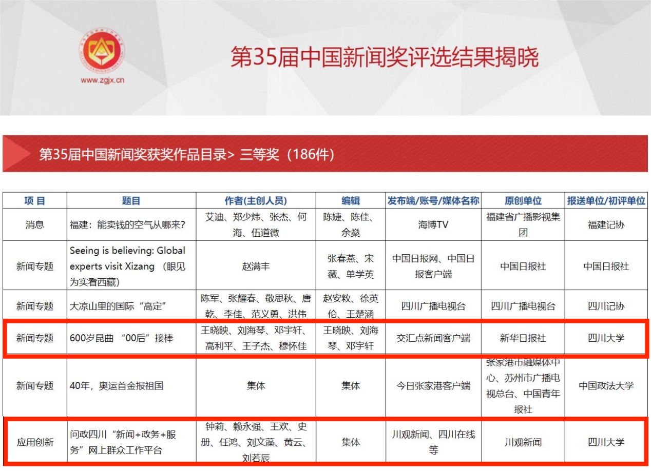 报送的新华日报社作品《600岁昆曲 “00后”接棒》和川观新闻作品《问政四川“新闻+政务+服务”网上群众工作平台》分别荣获新闻专题类和应用创新类三等奖。
