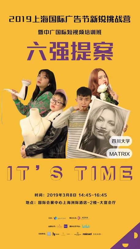 的大力支持下,广告学专业王婉如老师带领由广告学与符号学教研室选拔出的四位同学:2016级刘萌璐、刘怡贝、孙梦颖和2017级陈艳杰,组成MATRIX团队,在上海国际广告节Marcom新锐营的限时提案比拼中脱颖而出,淘汰二十四支队伍,跻身前六强,成功晋级。3月8日,MATRIX团队与来自厦门大学、中国传媒大学、温州大学、暨南大学等学校的其它5个团队同台竞技,在国家会展中心(上海)洲际酒店进行现场限时提案。最终,MATRIX团队取得全国第四名的优异成绩,总均分68.72分。