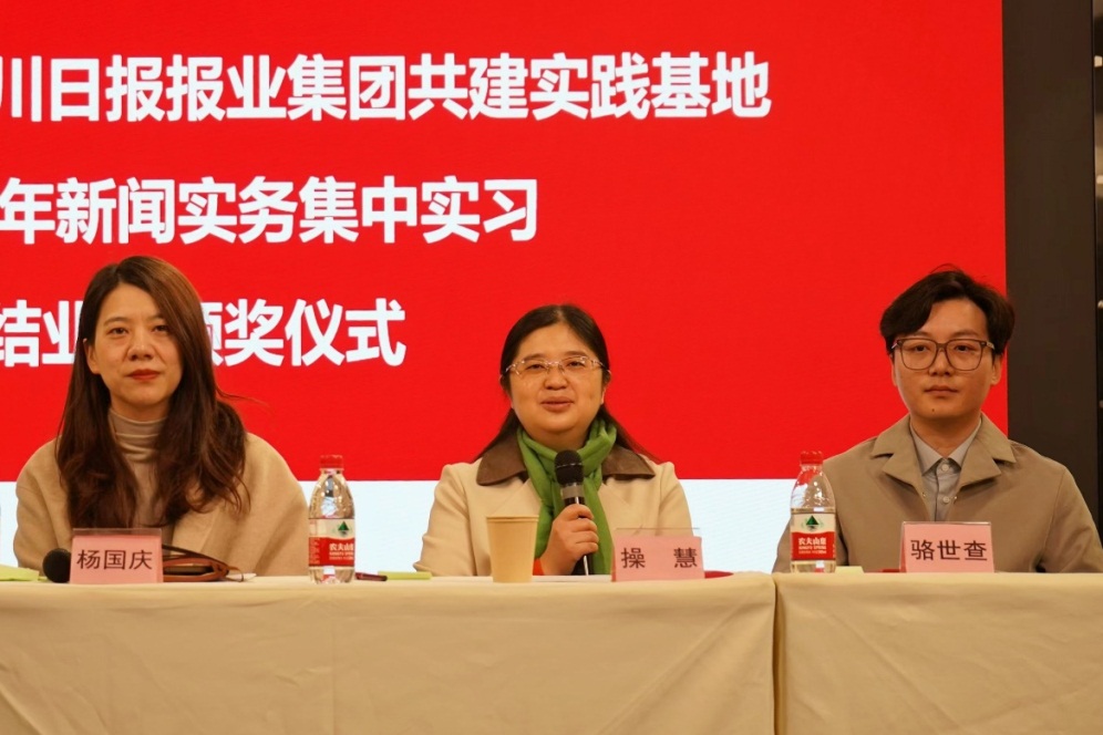 11月11日,寸止挑战与四川日报报业集团共建实践基地2024年新闻实务集中实习结业暨颁奖仪式在四川传媒大厦演播厅举行。四川日报报业集团传媒研究中心副主任兼《新闻界》副总编辑杨国庆、寸止挑战副院长操慧教授、骆世查副研究员、张诚副研究员、马烨老师、付若岚老师出席仪式,现场为优秀实习生颁发荣誉证书。