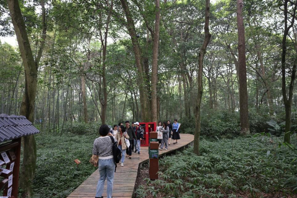 正式来到斑竹园园内,老师们先合影后自由赏景。新津斑竹林公园是川西平原腹心地带仅有的市级森林公园。竹林中空气清新、绿意盎然。且园中的斑竹、桢楠等已有百年历史。漫步在竹林小道,老师们目睹绿竹葱茏,呼吸香竹气息,体验着自然风韵。