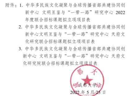 自2022年起,中心与分中心联合发布了两批次的科研项目课题招标公告,旨在推出系列标志性中心与分中心协同创新成果。2022年5月12日,中心与分中心、天府文化研究院联合发布的科研项目评审立项会议在成都大学行政楼305会议室召开。在中心与分中心的联合工作部署下,2022年度联合招标课题项目评审会由文明互鉴与“一带一路”研究分中心负责组织落实,成都大学副校长、中心学术委员会委员、文明互鉴与“一带一路”研究分中心主任、学术委员会主席杨玉华教授担任主持,分中心副主任谭筱玲、张学梅及分中心学术委员成员彭邦本、曾明、潘殊闲、马胜、袁联波、李敏、代显华、杜洁、诸丹等出席本次评审会议。