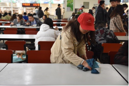 3月5日中午,志愿者们在约定地点高效分工,餐厅一楼和二楼分别安排了五名志愿者,他们穿梭在餐桌行列间,仔细清理打扫干净进餐完的餐桌。在完成自己所在分区的桌面清洁工作后,志愿者们互相帮助,积极清理了其他还未清洁完毕的分区。此次“光桌行动”覆盖整个江安校区西园一餐厅,体现了“新风”青年志愿者服务队的团队合作风采与公益心。活动中,食堂阿姨热心地问候志愿者们,提醒他们小心地滑,注意安全。就餐的同学也向志愿者们表达了谢意。