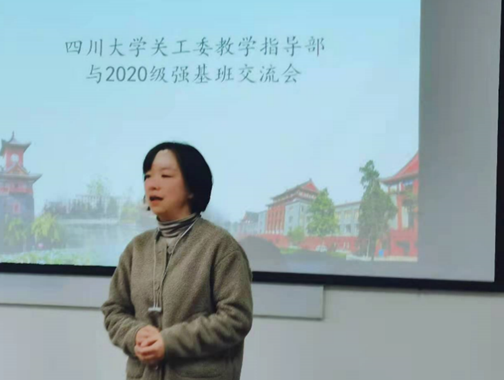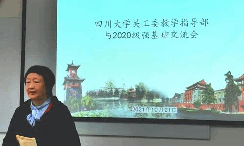 关工委教学指导部部长徐赐宁教授讲话,她向在座师生介绍了关工委的基本情况和跟班关爱活动的整体设想,指出学校关工委教学指导部的老师们将为强基班的同学们全程提供学习和生活上的指导和帮助,且会跟同学们建立一对一的联系,长期保持线上和线下的沟通与交流,帮助同学们挖掘更大的发展潜力,尽快成长为川大的优秀人才。