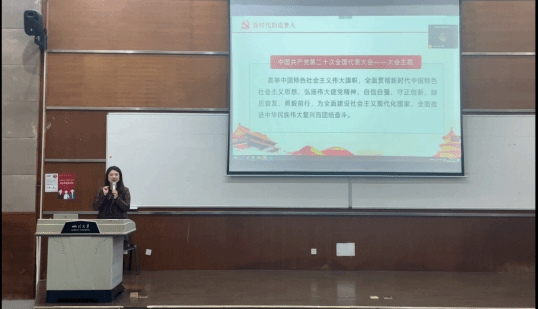 学科特色,为大家详细介绍了实施科教兴国战略与实现文化自信自强的具体路径,并由此强调了新时代青年的重要作用。为了更好地向大家传递当代中国优秀青年投身祖国建设精神,郑格老师播放了“大山的女儿”黄文秀的故事短片。黄文秀一心为民、倾力扶贫、舍身忘我的伟大奉献精神令同学们深受触动。在我们身边,文新学子当中也不乏发挥引领作用的榜样。寸止挑战2022级新闻与传播专业硕士生李芳作为一名退役军人,从“角色”定位出发,向同学们分享了自己对于国家安全与乡村振兴的认识,并表示:“如今作为一名研究生,希望我们都能够好好努力,心有底气地说出‘请党放心,强国有我’。”2022级新闻学专业硕士生王小翠、2022级中华文化国际传播专业硕士生张欣杨则结合自身支教经历,回顾了脱贫攻坚和乡村振兴的历程与成果。他们认为,在一批批投身实践的青年人身上,令人切实感受到了上下同心的脱贫攻坚精神和感召力量。