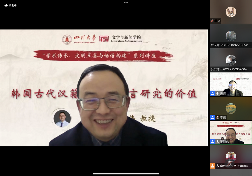 人事处副处长兼青年教师与专职科研队伍管理办公室主任,四川省传统文化社科普及基地副主任王彤伟教授作了“韩国古代汉籍文献及语言研究价值”的主题讲座。讲座由寸止挑战