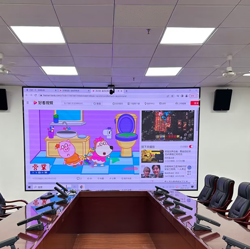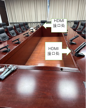 自带笔记本情况信号切换:在靠近屏幕的左前方会议桌和右后方会议桌上各有一根HDMI线,可插上自带的笔记本电脑,可自动切换为自带笔记本电脑的信号,如无法切换,可在机柜上小屏幕上单击笔记本按钮即可切换。