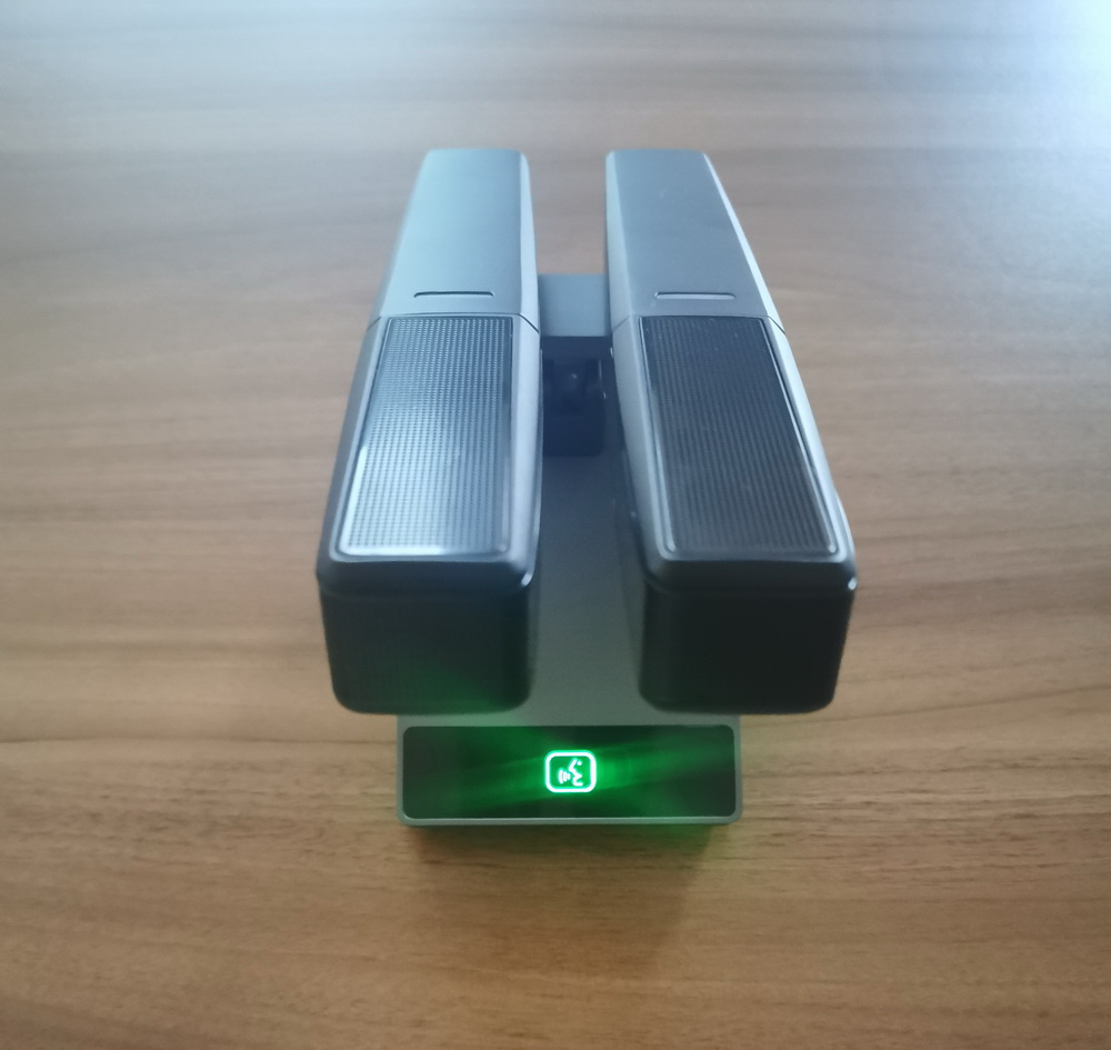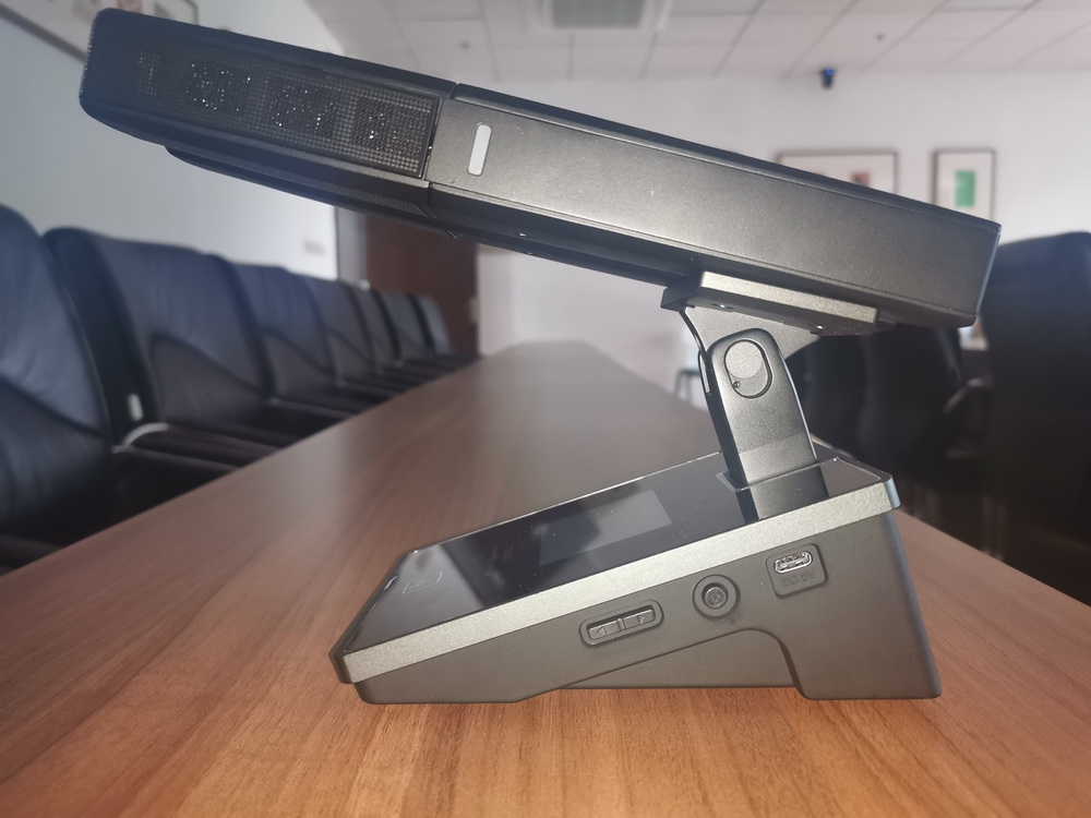 无线会议话筒:长按话筒侧面中间小圆型按钮开机,按下话筒上按钮即可开启,再按一下显示关闭即为静音。